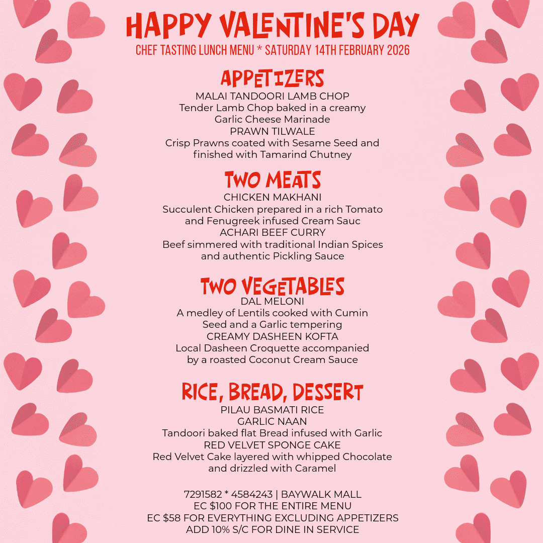 Our lunch menu is changed daily, but always follows the same concept of offering four vegetables, rice, bread and dessert, for a complete culinary experience. EC$58.00 (VAT inclusive) per person. Add 10% service charge if dining in. A La Carte Menu also available for lunch. Please inform the waiter how spicy or mild you would like your dish or if you would rather have a vegetarian option. We offer halal, gluten-free and celiac-friendly options upon request, subject to availability. Please confirm with the wait staff before ordering.